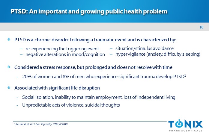 15 Candidate Indication Near - term Catalyst TNX - 102 SL Post - Traumatic Stress Disorder Top line data 1H 2016 TNX - 102 SL in Phase 2 development for post - traumatic stress disorder (PTSD) Preclinical Phase 1 Phase 2 Phase 3 NDA Market Tonmya / T NX - 102 SL (cyclobenzaprine HCl sublingual tablet, 2.8 mg) and TNX - 201 ( dexisometheptene mucate ) are Investigational New Drugs and are not approved for any indication.