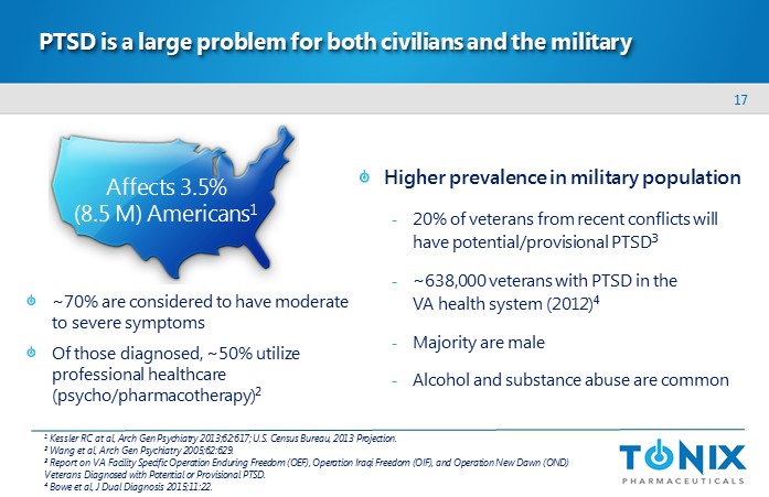 16 PTSD: An important and growing public health problem PTSD is a chronic disorder following a traumatic event and is characterized by: Considered a stress response, but prolonged and does not resolve with time - 20% of women and 8 % of men who experience significant trauma develop PTSD 1 Associated with significant life disruption - Social isolation, inability to maintain employment, loss of independent living - Unpredictable acts of violence, suicidal thoughts – re - experiencing the triggering event – negative alterations in mood/cognition – situation/stimulus avoidance – hypervigilance (anxiety, difficulty sleeping) 1 Kessler et al, Arch Gen Psychiatry 1995;52:1048.