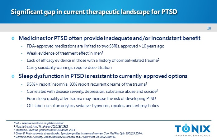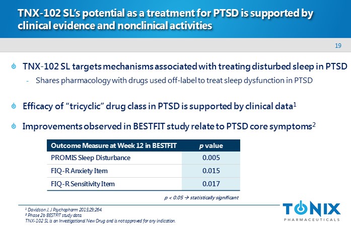 18 Significant gap in current therapeutic landscape for PTSD Medicines for PTSD often provide inadequate and/or inconsistent benefit - FDA - approved medications are limited to two SSRIs, approved >10 years ago - Weak evidence of treatment effect in men 1 - Lack of efficacy evidence in those with a history of combat - related trauma 2 - Carry suicidality warnings, require dose titration Sleep dysfunction in PTSD is resistant to currently - approved options - 95%+ report insomnia, 83% report recurrent dreams of the trauma 3 - Correlated with disease severity, depression, substance abuse and suicide 4 - Poor sleep quality after trauma may increase the risk of developing PTSD - Off - label use of anxiolytics, sedative - hypnotics, opiates, and antipsychotics SSRI = selective serotonin reuptake inhibitor 1 Marshall et al, Am J Psychiatry 2001;158:1982. 2 Jonathan Davidson, personal communications, 2014. 3 Green B. Post - traumatic stress disorder: Symptom profiles in men and women. Curr Med Res Opin 2003;19:200 – 4 . 4 Germain et al, J Anxiety Disord 2005;19:233; Krakow et al, J Nerv Ment Dis 2002;190:442.