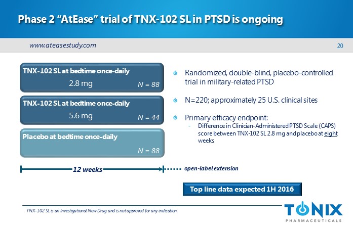 19 TNX - 102 SL’s potential as a treatment for PTSD is supported by clinical evidence and nonclinical activities TNX - 102 SL targets mechanisms associated with treating disturbed sleep in PTSD - Shares pharmacology with drugs used off - label to treat sleep dysfunction in PTSD Efficacy of “tricyclic” drug class in PTSD is supported by clinical data 1 Improvements observed in BESTFIT study relate to PTSD core symptoms 2 Outcome Measure at Week 12 in BESTFIT p value PROMIS Sleep Disturbance 0.005 FIQ - R Anxiety Item 0.015 FIQ - R Sensitivity Item 0.017 1 Davidson J, J Psychopharm 2015;29;264. 2 Phase 2b BESTFIT study data. TNX - 102 SL is an Investigational New Drug and is not approved for any indication . p < 0.05 s tatistically significant