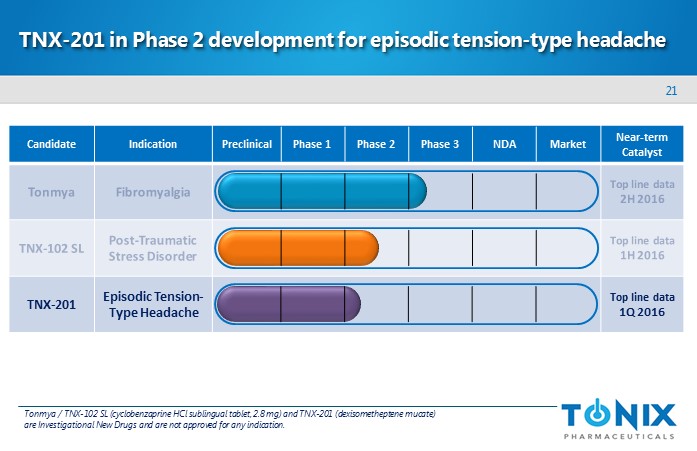 20 Phase 2 “ AtEase ” trial of TNX - 102 SL in PTSD is ongoing Randomized, double - blind, placebo - controlled trial in military - related PTSD N=220; approximately 25 U.S. clinical sites Primary efficacy endpoint: - Difference in Clinician - Administered PTSD Scale (CAPS) score between TNX - 102 SL 2.8 mg and placebo at eight weeks TNX - 102 SL is an Investigational New Drug and is not approved for any indication . Top line data expected 1H 2016 TNX - 102 SL at bedtime once - daily Placebo at bedtime once - daily 12 weeks N = 88 TNX - 102 SL at bedtime once - daily N = 88 N = 44 2.8 mg 5.6 mg open - label extension www.ateasestudy.com