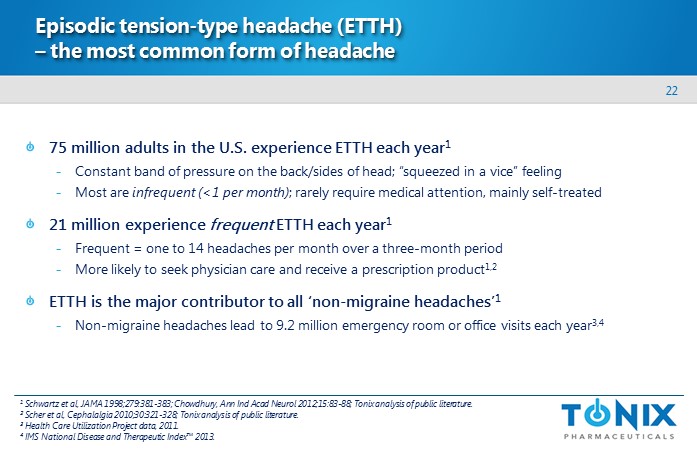 21 Candidate Indication Near - term Catalyst TNX - 201 Episodic Tension - Type Headache Top line data 1Q 2016 TNX - 201 in Phase 2 development for episodic tension - type headache Preclinical Phase 1 Phase 2 Phase 3 NDA Market Tonmya / T NX - 102 SL (cyclobenzaprine HCl sublingual tablet, 2.8 mg) and TNX - 201 ( dexisometheptene mucate ) are Investigational New Drugs and are not approved for any indication.