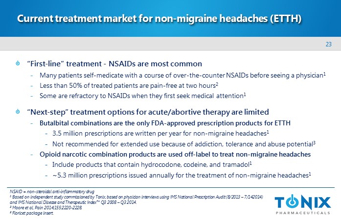 22 Episodic tension - type headache ( ETTH) – the most common form of headache 75 million adults in the U.S. experience ETTH each year 1 - Constant band of pressure on the back/sides of head; “squeezed in a vice” feeling - Most are infrequent (<1 per month) ; rarely require medical attention, mainly self - treated 21 million experience frequent ETTH each year 1 - Frequent = one to 14 headaches per month over a three - month period - More likely to seek physician care and receive a prescription product 1,2 ETTH is the major contributor to all ‘non - migraine headaches’ 1 - Non - migraine headaches lead to 9.2 million emergency room or office visits each year 3,4 1 Schwartz et al, JAMA 1998;279:381 - 383; Chowdhury, Ann Ind Acad Neurol 2012;15:83 - 88; Tonix analysis of public literature. 2 Scher et al, Cephalalgia 2010;30:321 - 328; Tonix analysis of public literature . 3 Health Care Utilization Project data, 2011. 4 IMS National Disease and Therapeutic Index™ 2013.