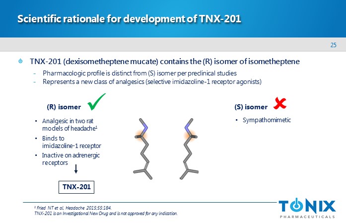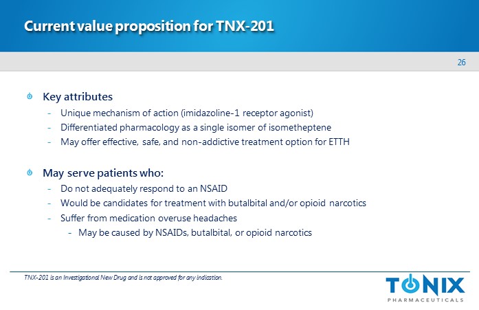25 Scientific rationale for development of TNX - 201 TNX - 201 ( dexisometheptene mucate ) contains the (R) isomer of isometheptene - Pharmacologic profile is distinct from (S) isomer per preclinical studies - Represents a new class of analgesics (selective imidazoline - 1 receptor agonists) (R) isomer (S) isomer • Analgesic in two rat models of headache 1 • Binds to imidazoline - 1 receptor • Inactive on adrenergic receptors • Sympathomimetic x TNX - 201 1 Fried NT et al, Headache 2015;55:184 . TNX - 201 is an Investigational New Drug and is not approved for any indication.