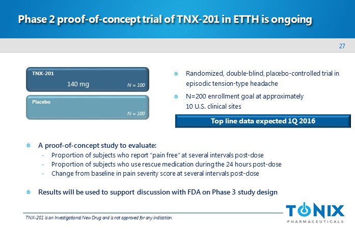 26 Current value proposition for TNX - 201 Key attributes - Unique mechanism of action (imidazoline - 1 receptor agonist) - Differentiated pharmacology as a single isomer of isometheptene - May offer effective, safe, and non - addictive treatment option for ETTH May serve patients who: - Do not adequately respond to an NSAID - Would be candidates for treatment with butalbital and/or opioid narcotics - Suffer from medication overuse headaches - May be caused by NSAIDs, butalbital , or opioid narcotics TNX - 201 is an Investigational New Drug and is not approved for any indication .
