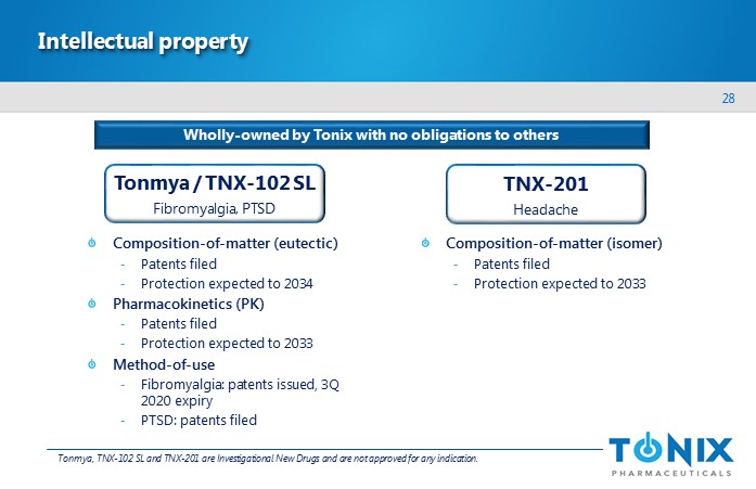 28 Intellectual property Composition - of - matter (eutectic) - Patents filed - Protection expected to 2034 Pharmacokinetics (PK) - Patents filed - Protection expected to 2033 Method - of - use - Fibromyalgia: patents issued, 3Q 2020 expiry - PTSD: patents filed Tonmya / TNX - 102 SL Fibromyalgia, PTSD Composition - of - matter (isomer) - Patents filed - Protection expected to 2033 TNX - 201 Headache Tonmya, TNX - 102 SL and TNX - 201 are Investigational New Drugs and are not approved for any indication. Wholly - owned by Tonix with no obligations to others