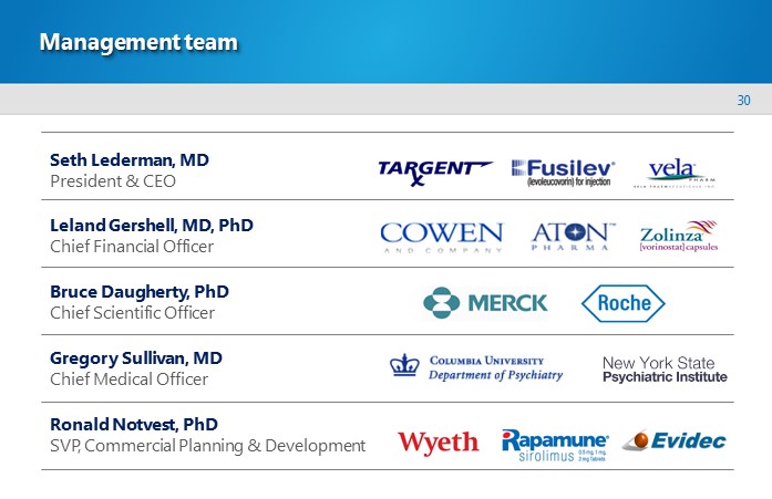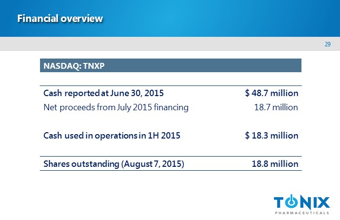 29 Financial overview NASDAQ: TNXP Cash reported at June 30, 2015 $ 48.7 million Net proceeds from July 2015 financing 18.7 million Cash used in operations in 1H 2015 $ 18.3 million Shares outstanding (August 7, 2015) 18.8 million
