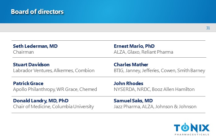 30 Management team Seth Lederman, MD President & CEO Leland Gershell, MD, PhD Chief Financial Officer Bruce Daugherty, PhD Chief Scientific Officer Ronald Notvest, PhD SVP, Commercial Planning & Development Gregory Sullivan, MD Chief Medical Officer