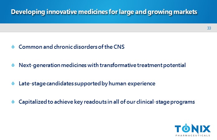 32 Milestones – recent and upcoming Tonmya – Fibromyalgia □ May 2015 Began Phase 3 AFFIRM study □ June 2015 Presented additional data from Phase 2b BESTFIT study at EULAR □ 2H 2016 Report top - line results from AFFIRM study TNX - 102 SL – Post - Traumatic Stress Disorder □ January 2015 Began Phase 2 AtEase study in military - related PTSD □ 1H 2016 Report top - line results from AtEase study TNX - 201 – Episodic Tension - Type Headache □ June 2015 Began randomization in proof - of - concept Phase 2 study □ June 2015 Presented non - clinical data at AHS (receptor, animal models) □ 1Q 2016 Report top - line results from proof - of - concept Phase 2 study x x x Tonmya / TNX - 102 SL and TNX - 201 are Investigational New Drugs and are not approved for any indication. x x