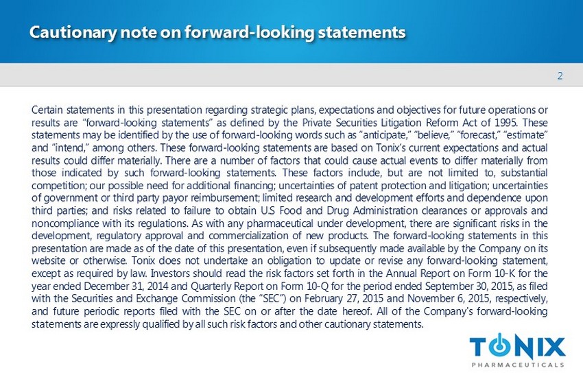 NASDAQ: TNXP Investor Presentation November 2015 © 2015 Tonix Pharmaceuticals Holding Corp.
