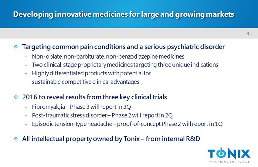 2 Cautionary note on forward - looking statements Certain statements in this presentation regarding strategic plans, expectations and objectives for future operations or results are “forward - looking statements” as defined by the Private Securities Litigation Reform Act of 1995 . These statements may be identified by the use of forward - looking words such as “anticipate,” “believe,” “forecast,” “estimate” and “intend,” among others . These forward - looking statements are based on Tonix’s current expectations and actual results could differ materially . There are a number of factors that could cause actual events to differ materially from those indicated by such forward - looking statements . These factors include, but are not limited to, substantial competition ; our possible need for additional financing ; uncertainties of patent protection and litigation ; uncertainties of government or third party payor reimbursement ; limited research and development efforts and dependence upon third parties ; and risks related to failure to obtain U . S Food and Drug Administration clearances or approvals and noncompliance with its regulations . As with any pharmaceutical under development, there are significant risks in the development, regulatory approval and commercialization of new products . The forward - looking statements in this presentation are made as of the date of this presentation, even if subsequently made available by the Company on its website or otherwise . Tonix does not undertake an obligation to update or revise any forward - looking statement, except as required by law . Investors should read the risk factors set forth in the Annual Report on Form 10 - K for the year ended December 31 , 2014 and Quarterly Report on Form 10 - Q for the period ended September 30 , 2015 , as filed with the Securities and Exchange Commission (the “SEC”) on February 27 , 2015 and November 6 , 2015 , respectively, and future periodic reports filed with the SEC on or after the date hereof . All of the Company's forward - looking statements are expressly qualified by all such risk factors and other cautionary statements .