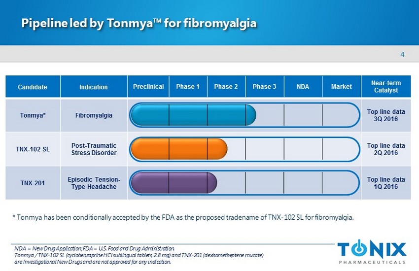 3 Developing innovative medicines for large and growing markets Targeting common pain conditions and a serious psychiatric disorder - Non - opiate, non - barbiturate, non - benzodiazepine medicines - Two clinical - stage proprietary medicines targeting three unique indications - Highly differentiated products with potential for sustainable competitive clinical advantages 2016 to reveal results from three key clinical trials - Fibromyalgia – Phase 3 will report in 3Q - Post - traumatic stress disorder – Phase 2 will report in 2Q - Episodic tension - type headache – proof - of - concept Phase 2 will report in 1Q All intellectual property owned by Tonix – from internal R&D