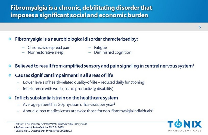 4 Candidate Indication Near - term Catalyst Tonmya * Fibromyalgia Top line data 3Q 2016 TNX - 102 SL Post - Traumatic Stress Disorder Top line data 2Q 2016 TNX - 201 Episodic Tension - Type Headache Top line data 1Q 2016 Pipeline led by Tonmya™ for fibromyalgia Preclinical Phase 1 Phase 2 Phase 3 NDA Market NDA = New Drug Application; FDA = U.S. Food and Drug Administration. Tonmya / T NX - 102 SL (cyclobenzaprine HCl sublingual tablets, 2.8 mg) and TNX - 201 ( dexisometheptene mucate ) are Investigational New Drugs and are not approved for any indication. * Tonmya has been conditionally accepted by the FDA as the proposed tradename of TNX - 102 SL for fibromyalgia.
