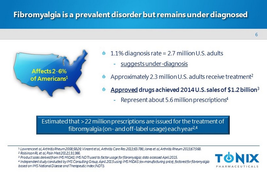 5 Fibromyalgia is a chronic, debilitating disorder that imposes a significant social and economic burden Fibromyalgia is a neurobiological disorder characterized by : Believed to result from amplified sensory and pain signaling in central nervous system 1 Causes significant impairment in all areas of life - Lower levels of health - related quality - of - life – reduced daily functioning - Interference with work (loss of productivity, disability ) Inflicts substantial strain on the healthcare system - Average patient has 20 physician office visits per year 2 - Annual direct medical costs are twice those for non - fibromyalgia individuals 3 1 Phillips K & Clauw DJ, Best Pract Res Clin Rheumatol 2011;25:141. 2 Robinson et al, Pain Medicine 2013;14:1400. 3 White et al, J Occupational Environ Med 2008;50:13. – C hronic widespread pain – Nonrestorative sleep – Fatigue – D iminished cognition