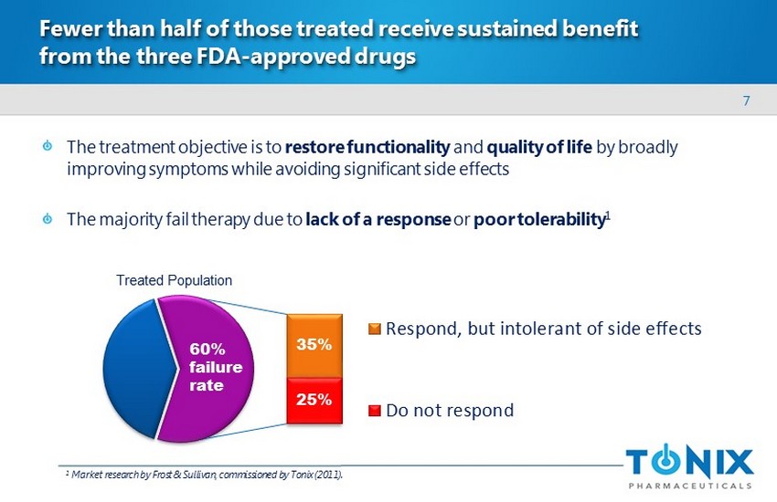 6 Fibromyalgia is a prevalent disorder but remains under diagnosed 1 Lawrence et al, Arthritis Rheum 2008;58:26; Vincent et al, Arthritis Care Res 2013;65:786; Jones et al, Arthritis Rheum 2015; 67 :568. 2 Robinson RL et al, Pain Med 2012;13:1366. 3 Product sales derived from IMS MIDAS; IMS NDTI used to factor usage for fibromyalgia; data accessed April 2015. 4 Independent study conducted by IMS Consulting Group, April 2015 using IMS MIDAS (ex - manufacturing price), factored for fibromya lgia based on IMS National Disease and Therapeutic Index (NDTI). Affects 2 - 6% of Americans 1 1.1% diagnosis rate = 2.7 million U.S. adults - suggests under - diagnosis Approximately 2.3 million U.S. adults receive treatment 2 Approved drugs achieved 2014 U.S. sales of $1.2 billion 3 - Represent about 5.6 million prescriptions 4 Estimated that >22 million prescriptions are issued for the treatment of fibromyalgia (on - and off - label usage) each year 2,4