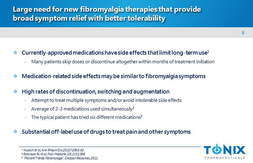 7 Fewer than half of those treated receive sustained benefit from the three FDA - approved drugs The treatment objective is to restore functionality and quality of life by broadly improving symptoms while avoiding significant side effects The majority fail therapy due to lack of a response or poor tolerability 1 Respond, but intolerant of side effects Do not respond 25% 35% 60% failure rate 1 Market research by Frost & Sullivan, commissioned by Tonix (2011). T reated P opulation