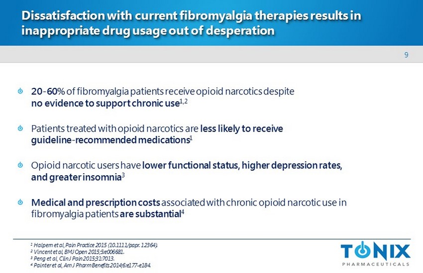 8 Large need for new fibromyalgia therapies that provide broad symptom relief with better tolerability Currently - approved medications have side effects that limit long - term use 1 - Many patients skip doses or discontinue altogether within months of treatment initiation Medication - related side effects may be similar to fibromyalgia symptoms High rates of discontinuation, switching and augmentation - A ttempt to treat multiple symptoms and/or avoid intolerable side effects - Average of 2 - 3 medications used simultaneously 2 - The typical patient has tried six different medications 3 Substantial off - label use of drugs to treat pain and other symptoms 1 Nuesch et al, Ann Rheum Dis 2013;72:955 - 62. 2 Robinson RL et al, Pain Medicine 2012;13:1366. 3 “Patient Trends: Fibromyalgia”, Decision Resources, 2011.