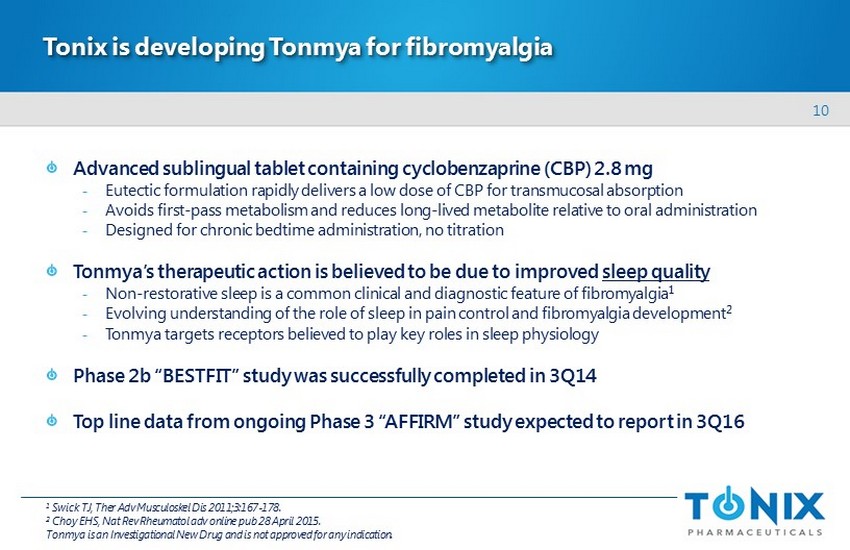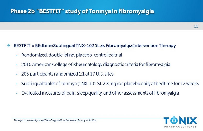 10 Tonix is developing Tonmya for fibromyalgia Advanced sublingual tablet containing cyclobenzaprine (CBP) 2.8 mg - Eutectic formulation rapidly delivers a low dose of CBP for transmucosal absorption - A voids first - pass metabolism and r educes long - lived metabolite relative to oral administration - Designed for chronic bedtime administration, no titration Tonmya’s therapeutic action is believed to be due to improved sleep quality - Non - restorative sleep is a common clinical and diagnostic feature of fibromyalgia 1 - Evolving understanding of the role of sleep in pain control and fibromyalgia development 2 - Tonmya targets receptors believed to play key roles in sleep physiology Phase 2b “BESTFIT” study was successfully completed in 3Q14 Top line data from ongoing Phase 3 “AFFIRM” study expected to report in 3Q16 1 Swick TJ, Ther Adv Musculoskel Dis 2011;3:167 - 178 . 2 Choy EHS, Nat Rev Rheumatol adv online pub 28 April 2015. Tonmya is an Investigational New Drug and is not approved for any indication.