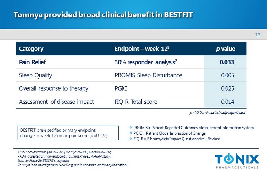 11 Phase 2b “BESTFIT” study of Tonmya in fibromyalgia BESTFIT = BE dtime S ublingual T NX - 102 SL as F ibromyalgia I ntervention T herapy - Randomized , double - blind, placebo - controlled trial - 2010 American College of Rheumatology diagnostic criteria for fibromyalgia - 205 participants randomized 1:1 at 17 U.S. sites - S ublingual tablet of Tonmya (TNX - 102 SL 2.8 mg) or placebo daily at bedtime for 12 weeks - Evaluated measures of pain, sleep quality, and other assessments of fibromyalgia Tonmya is an Investigational New Drug and is not approved for any indication.