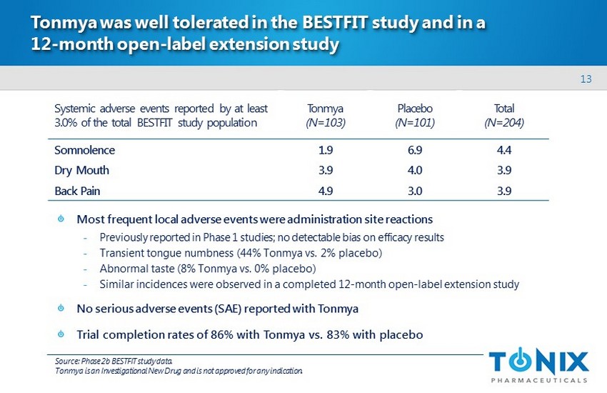 12 Tonmya provided broad clinical benefit in BESTFIT Category Endpoint – week 12 1 p value Pain Relief 30% responder analysis 2 0.033 Sleep Quality PROMIS Sleep Disturbance 0.005 Overal l response to therapy PGIC 0.025 Assessment of disease impact FIQ - R Total score 0.014 1 Intent - to - treat analysis, N=205 (Tonmya N=103, placebo N=102 ). 2 FDA - accepted primary endpoint in current Phase 3 AFFIRM study. Source : Phase 2b BESTFIT study data. Tonmya is an Investigational New Drug and is not approved for any indication. BESTFIT pre - specified primary endpoint: change in week 12 mean pain score (p=0.172) PROMIS = Patient - Reported Outcomes Measurement Information System PGIC = Patient Global Impression of Change FIQ - R = Fibromyalgia Impact Questionnaire - Revised p < 0.05 s tatistically significant