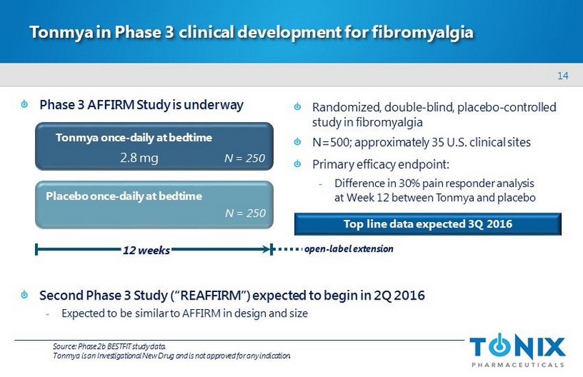 13 Tonmya was well tolerated in the BESTFIT study and in a 12 - month open - label extension study Most frequent local adverse events were administration site reactions - Previously reported in Phase 1 studies; no detectable bias on efficacy results - Transient tongue numbness ( 44% Tonmya vs . 2% placebo) - Abnormal taste (8% Tonmya vs . 0% placebo ) - Similar incidences were observed in a completed 12 - month open - label extension study No serious adverse events (SAE) reported with Tonmya Trial completion rates of 86% with Tonmya vs. 83% with placebo Systemic adverse events reported by at least 3.0% of the total BESTFIT study population Tonmya (N=103) Placebo (N=101) Total (N=204) Somnolence 1.9 6.9 4.4 Dry Mouth 3.9 4.0 3.9 Back Pain 4.9 3.0 3.9 Source: Phase 2b BESTFIT study data. Tonmya is an Investigational New Drug and is not approved for any indication.