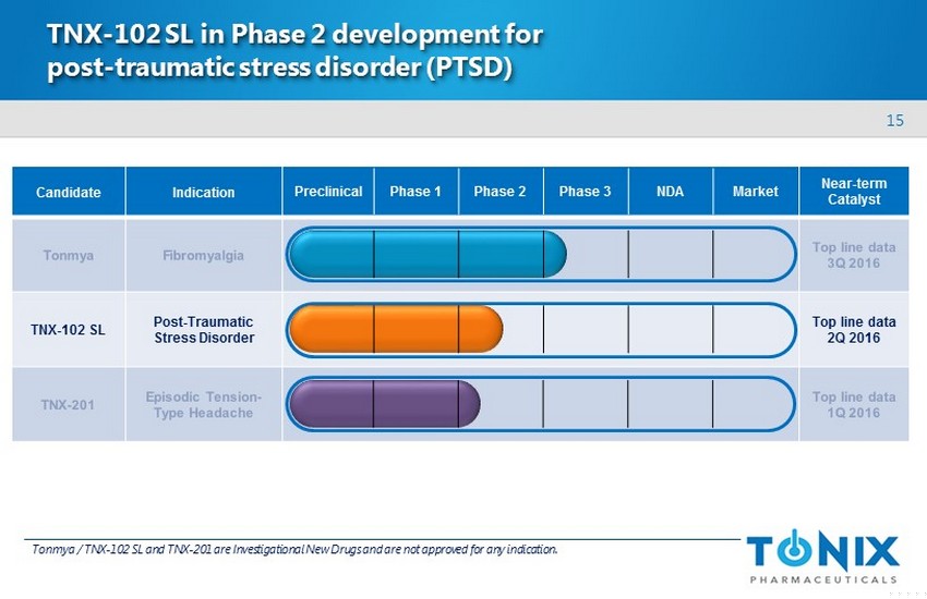 14 Phase 3 AFFIRM Study is underway Second Phase 3 Study (“REAFFIRM”) expected to begin in 2Q 2016 - E xpected to be similar to AFFIRM in design and size Tonmya in Phase 3 clinical development for fibromyalgia Randomized, double - blind, placebo - controlled study in fibromyalgia N=500; approximately 35 U.S. clinical sites Primary efficacy endpoint: - Difference in 30% pain responder analysis at Week 12 between Tonmya and placebo Placebo once - daily at bedtime 12 weeks Tonmya once - daily at bedtime N = 250 N = 250 2.8 mg open - label extension Source: Phase 2b BESTFIT study data. Tonmya is an Investigational New Drug and is not approved for any indication. Top line data expected 3 Q 2016