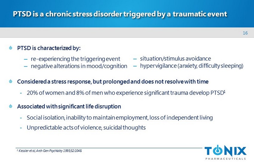 15 Candidate Indication Near - term Catalyst TNX - 102 SL Post - Traumatic Stress Disorder Top line data 2Q 2016 TNX - 102 SL in Phase 2 development for post - traumatic stress disorder (PTSD) Preclinical Phase 1 Phase 2 Phase 3 NDA Market Tonmya / T NX - 102 SL and TNX - 201 are Investigational New Drugs and are not approved for any indication.