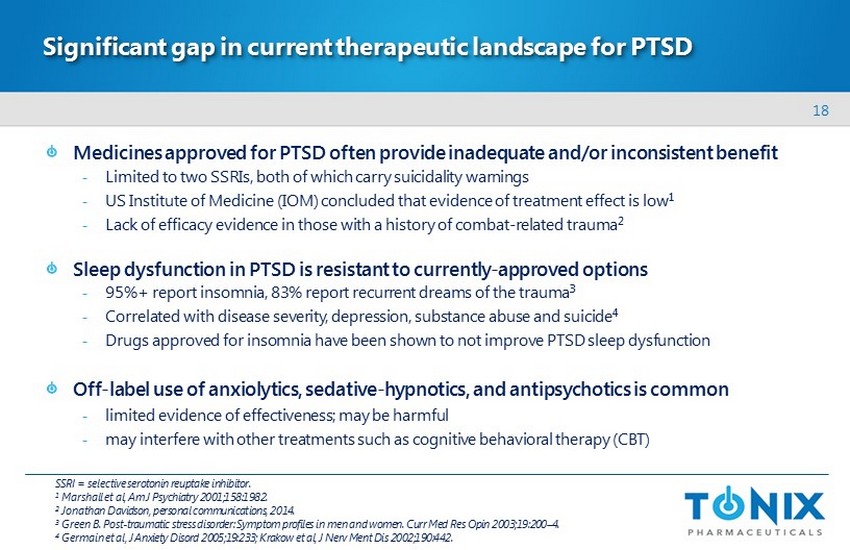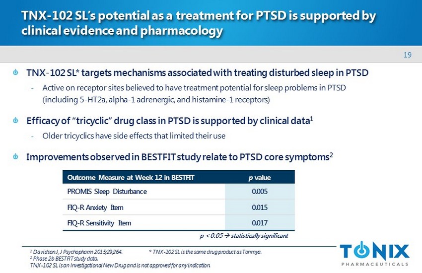 18 Significant gap in current therapeutic landscape for PTSD M edicines approved for PTSD often provide inadequate and/or inconsistent benefit - Limited to two SSRIs, both of which carry suicidality warnings - US Institute of Medicine (IOM) concluded that evidence of treatment effect is low 1 - Lack of efficacy evidence in those with a history of combat - related trauma 2 Sleep dysfunction in PTSD is resistant to currently - approved options - 95 %+ report insomnia, 83% report recurrent dreams of the trauma 3 - Correlated with disease severity, depression, substance abuse and suicide 4 - Drugs approved for insomnia have been shown to not improve PTSD sleep dysfunction Off - label use of anxiolytics, sedative - hypnotics, and antipsychotics is common - limited evidence of effectiveness; may be harmful - m ay interfere with other treatments such as cognitive behavioral therapy (CBT) SSRI = selective serotonin reuptake inhibitor. 1 Marshall et al, Am J Psychiatry 2001;158:1982. 2 Jonathan Davidson, personal communications, 2014. 3 Green B. Post - traumatic stress disorder: Symptom profiles in men and women. Curr Med Res Opin 2003;19:200 – 4 . 4 Germain et al, J Anxiety Disord 2005;19:233; Krakow et al, J Nerv Ment Dis 2002;190:442.