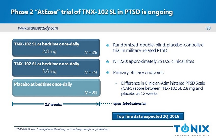 19 TNX - 102 SL’s potential as a treatment for PTSD is supported by clinical evidence and pharmacology TNX - 102 SL* targets mechanisms associated with treating disturbed sleep in PTSD - Active on receptor sites believed to have treatment potential for sleep problems in PTSD (including 5 - HT2a, alpha - 1 adrenergic, and histamine - 1 receptors) Efficacy of “tricyclic” drug class in PTSD is supported by clinical data 1 - Older tricyclics have side effects that limited their use Improvements observed in BESTFIT study relate to PTSD core symptoms 2 Outcome Measure at Week 12 in BESTFIT p value PROMIS Sleep Disturbance 0.005 FIQ - R Anxiety Item 0.015 FIQ - R Sensitivity Item 0.017 1 Davidson J, J Psychopharm 2015;29;264. * TNX - 102 SL is the same drug product as Tonmya . 2 Phase 2b BESTFIT study data. TNX - 102 SL is an Investigational New Drug and is not approved for any indication . p < 0.05 s tatistically significant