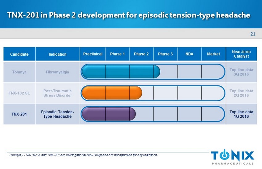 20 Phase 2 “ AtEase ” trial of TNX - 102 SL in PTSD is ongoing Randomized, double - blind, placebo - controlled trial in military - related PTSD N=220; approximately 25 U.S. clinical sites Primary efficacy endpoint: - Difference in Clinician - Administered PTSD Scale (CAPS) score between TNX - 102 SL 2.8 mg and placebo at 12 weeks TNX - 102 SL is an Investigational New Drug and is not approved for any indication . Top line data expected 2Q 2016 TNX - 102 SL at bedtime once - daily Placebo at bedtime once - daily 12 weeks N = 88 TNX - 102 SL at bedtime once - daily N = 88 N = 44 2.8 mg 5.6 mg open - label extension www.ateasestudy.com