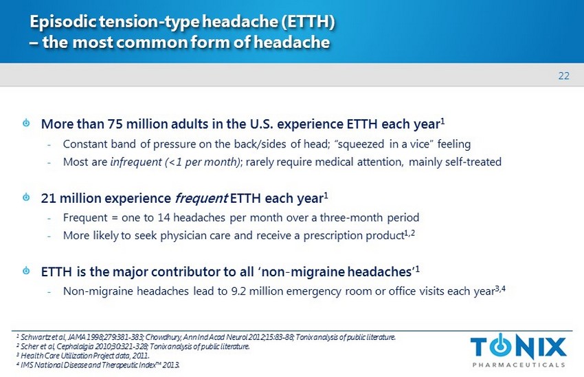21 Candidate Indication Near - term Catalyst TNX - 201 Episodic Tension - Type Headache Top line data 1Q 2016 TNX - 201 in Phase 2 development for episodic tension - type headache Preclinical Phase 1 Phase 2 Phase 3 NDA Market Tonmya / T NX - 102 SL and TNX - 201 are Investigational New Drugs and are not approved for any indication.