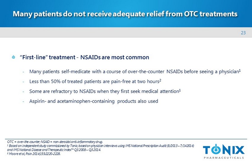 22 Episodic tension - type headache ( ETTH) – the most common form of headache More than 75 million adults in the U.S. experience ETTH each year 1 - Constant band of pressure on the back/sides of head; “squeezed in a vice” feeling - Most are infrequent (<1 per month) ; rarely require medical attention, mainly self - treated 21 million experience frequent ETTH each year 1 - Frequent = one to 14 headaches per month over a three - month period - More likely to seek physician care and receive a prescription product 1,2 ETTH is the major contributor to all ‘non - migraine headaches’ 1 - Non - migraine headaches lead to 9.2 million emergency room or office visits each year 3,4 1 Schwartz et al, JAMA 1998;279:381 - 383; Chowdhury, Ann Ind Acad Neurol 2012;15:83 - 88; Tonix analysis of public literature. 2 Scher et al, Cephalalgia 2010;30:321 - 328; Tonix analysis of public literature . 3 Health Care Utilization Project data, 2011. 4 IMS National Disease and Therapeutic Index™ 2013.