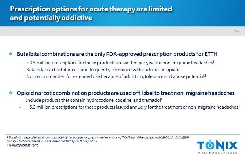 23 Many patients do not receive adequate relief from OTC treatments “First - line” treatment - NSAIDs are most common - Many patients self - medicate with a course of over - the - counter NSAIDs before seeing a physician 1 - Less than 50% of treated patients are pain - free at two hours 2 - Some are refractory to NSAIDs when they first seek medical attention 1 - Aspirin - and acetaminophen - containing products also used OTC = over - the - counter; NSAID = non - steroidal anti - inflammatory drug. 1 Based on independent study commissioned by Tonix , based on physician interviews using IMS National Prescription Audit (8/2013 – 7/142014) and IMS National Disease and Therapeutic Index™ Q3 2008 – Q3 2014. 2 Moore et al, Pain 2014;155:2220 - 2228.
