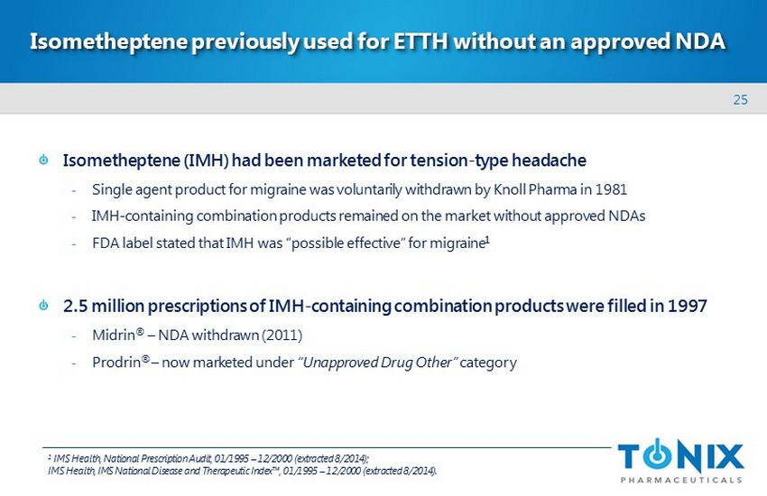 24 Prescription options for acute therapy are limited and potentially addictive Butalbital combinations are the only FDA - approved prescription products for ETTH - ~3.5 million prescriptions for these products are written per year for non - migraine headaches 1 - Butalbital is a barbiturate – and frequently combined with codeine, an opiate - Not recommended for extended use because of addiction, tolerance and abuse potential 2 Opioid narcotic combination products are used off - label to treat non - migraine headaches - Include products that contain hydrocodone, codeine, and tramadol 1 - ~5.3 million prescriptions for these products issued annually for the treatment of non - migraine headaches 1 1 Based on independent study commissioned by Tonix, based on physician interviews using IMS National Prescription Audit (8/2013 – 7/142014) and IMS National Disease and Therapeutic Index™ Q3 2008 – Q3 2014. 2 Fioricet package insert .