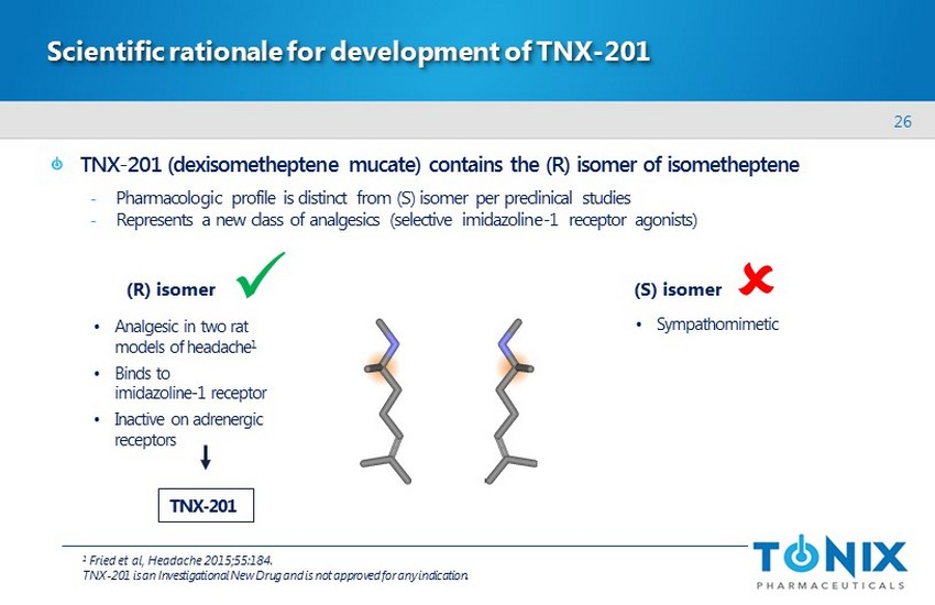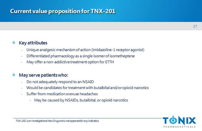26 Scientific rationale for development of TNX - 201 TNX - 201 ( dexisometheptene mucate ) contains the (R) isomer of isometheptene - Pharmacologic profile is distinct from (S) isomer per preclinical studies - Represents a new class of analgesics (selective imidazoline - 1 receptor agonists) (R) isomer (S) isomer • Analgesic in two rat models of headache 1 • Binds to imidazoline - 1 receptor • Inactive on adrenergic receptors • Sympathomimetic x TNX - 201 1 Fried et al, Headache 2015;55:184 . TNX - 201 is an Investigational New Drug and is not approved for any indication.