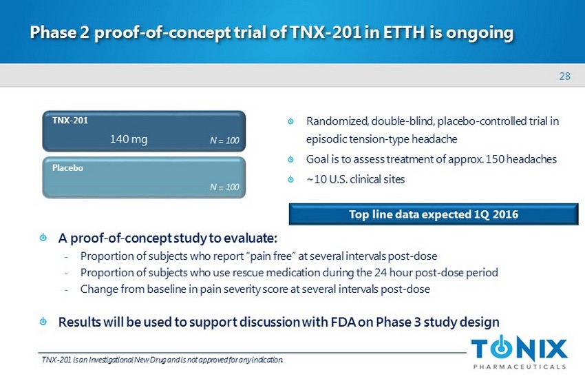 27 Current value proposition for TNX - 201 Key attributes - Unique analgesic mechanism of action (imidazoline - 1 receptor agonist) - Differentiated pharmacology as a single isomer of isometheptene - May offer a non - addictive treatment option for ETTH May serve patients who: - Do not adequately respond to an NSAID - Would be candidates for treatment with butalbital and/or opioid narcotics - Suffer from medication overuse headaches - May be caused by NSAIDs, butalbital , or opioid narcotics TNX - 201 is an Investigational New Drug and is not approved for any indication .
