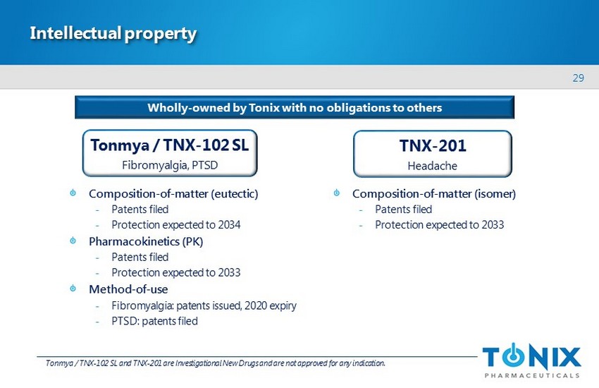 29 Intellectual property Composition - of - matter (eutectic) - Patents filed - Protection expected to 2034 Pharmacokinetics (PK) - Patents filed - Protection expected to 2033 Method - of - use - Fibromyalgia: patents issued, 2020 expiry - PTSD: patents filed Tonmya / TNX - 102 SL Fibromyalgia, PTSD Composition - of - matter (isomer) - Patents filed - Protection expected to 2033 TNX - 201 Headache Tonmya / T NX - 102 SL and TNX - 201 are Investigational New Drugs and are not approved for any indication . Wholly - owned by Tonix with no obligations to others