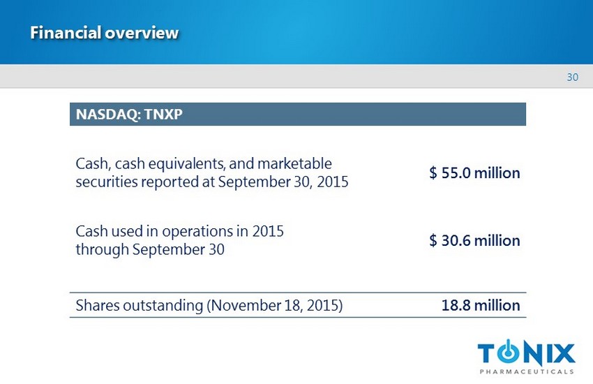 30 Financial overview NASDAQ: TNXP Cash, cash equivalents, and marketable securities reported at September 30, 2015 $ 55.0 million Cash used in operations in 2015 through September 30 $ 30.6 million Shares outstanding (November 18, 2015) 18.8 million