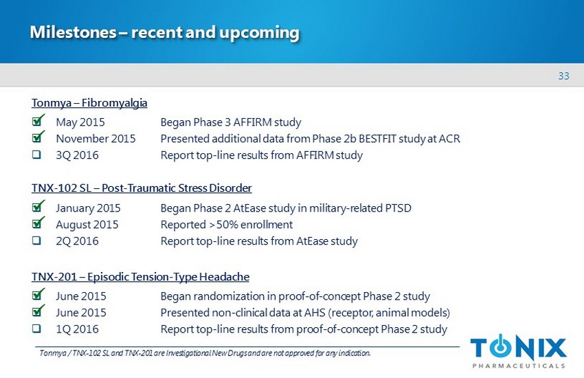 33 Milestones – recent and upcoming Tonmya – Fibromyalgia □ May 2015 Began Phase 3 AFFIRM study □ November 2015 Presented additional data from Phase 2b BESTFIT study at ACR □ 3Q 2016 Report top - line results from AFFIRM study TNX - 102 SL – Post - Traumatic Stress Disorder □ January 2015 Began Phase 2 AtEase study in military - related PTSD □ August 2015 Reported >50% enrollment □ 2Q 2016 Report top - line results from AtEase study TNX - 201 – Episodic Tension - Type Headache □ June 2015 Began randomization in proof - of - concept Phase 2 study □ June 2015 Presented non - clinical data at AHS (receptor, animal models) □ 1Q 2016 Report top - line results from proof - of - concept Phase 2 study x Tonmya / T NX - 102 SL and TNX - 201 are Investigational New Drugs and are not approved for any indication . x x x x x