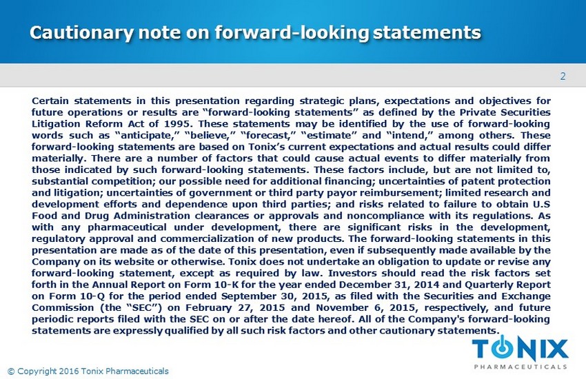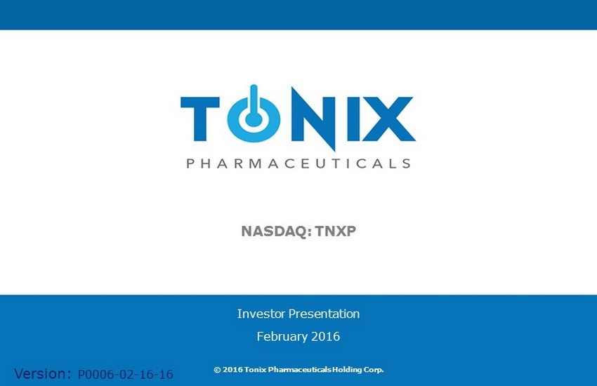 © Copyright 2016 Tonix Pharmaceuticals - Confidential - Do not duplicate or distribute NASDAQ: TNXP Investor Presentation February 2016 © 2016 Tonix Pharmaceuticals Holding Corp. Version: P0006 - 02 - 16 - 16