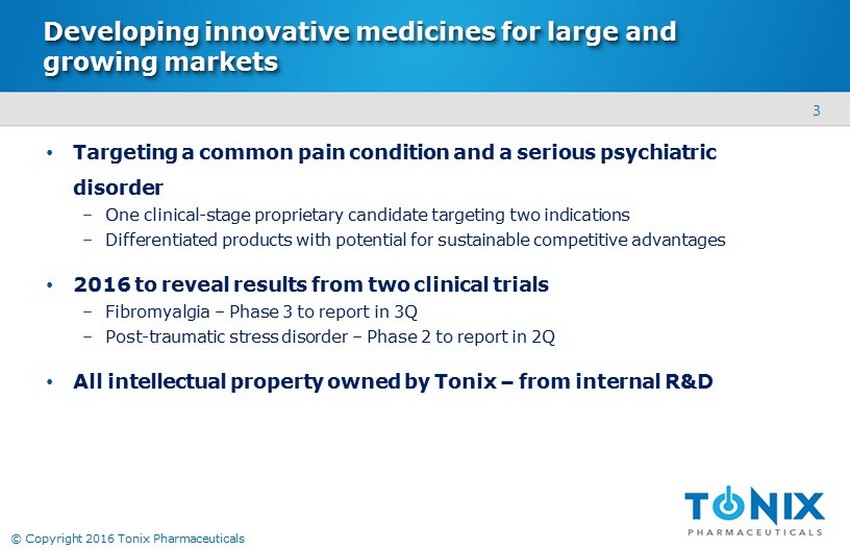 2 © Copyright 2016 Tonix Pharmaceuticals Cautionary note on forward - looking statements Certain statements in this presentation regarding strategic plans, expectations and objectives for future operations or results are “forward - looking statements” as defined by the Private Securities Litigation Reform Act of 1995 . These statements may be identified by the use of forward - looking words such as “anticipate,” “believe,” “forecast,” “estimate” and “intend,” among others . These forward - looking statements are based on Tonix’s current expectations and actual results could differ materially . There are a number of factors that could cause actual events to differ materially from those indicated by such forward - looking statements . These factors include, but are not limited to, substantial competition ; our possible need for additional financing ; uncertainties of patent protection and litigation ; uncertainties of government or third party payor reimbursement ; limited research and development efforts and dependence upon third parties ; and risks related to failure to obtain U . S Food and Drug Administration clearances or approvals and noncompliance with its regulations . As with any pharmaceutical under development, there are significant risks in the development, regulatory approval and commercialization of new products . The forward - looking statements in this presentation are made as of the date of this presentation, even if subsequently made available by the Company on its website or otherwise . Tonix does not undertake an obligation to update or revise any forward - looking statement, except as required by law . Investors should read the risk factors set forth in the Annual Report on Form 10 - K for the year ended December 31 , 2014 and Quarterly Report on Form 10 - Q for the period ended September 30 , 2015 , as filed with the Securities and Exchange Commission (the “SEC”) on February 27 , 2015 and November 6 , 2015 , respectively, and future periodic reports filed with the SEC on or after the date hereof . All of the Company's forward - looking statements are expressly qualified by all such risk factors and other cautionary statements .