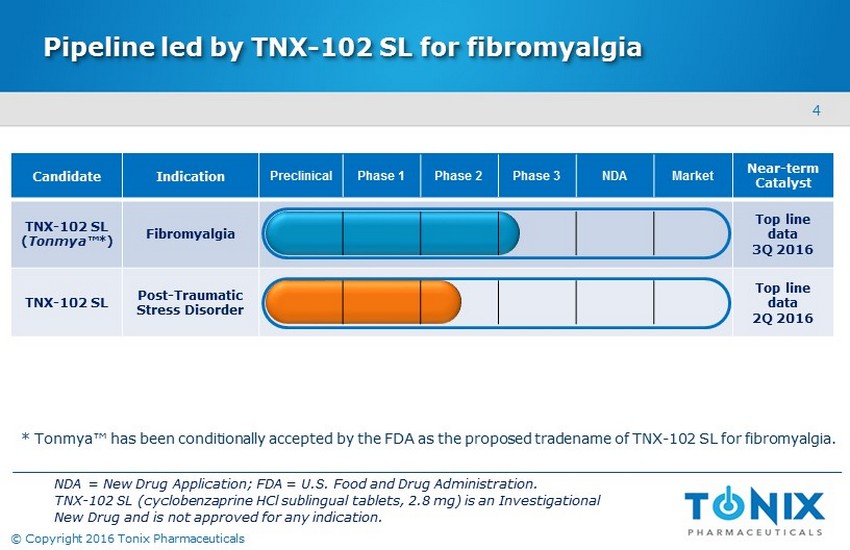 3 © Copyright 2016 Tonix Pharmaceuticals Developing innovative medicines for large and growing markets • Targeting a common pain condition and a serious psychiatric disorder ‒ One clinical - stage proprietary candidate targeting two indications ‒ Differentiated products with potential for sustainable competitive advantages • 2016 to reveal results from two clinical trials ‒ Fibromyalgia – Phase 3 to report in 3Q ‒ Post - traumatic stress disorder – Phase 2 to report in 2Q • All intellectual property owned by Tonix – from internal R&D