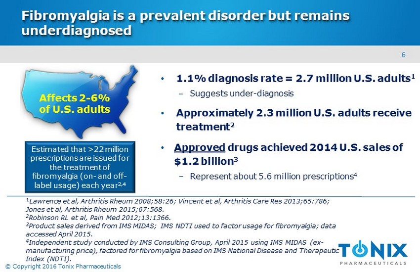 5 © Copyright 2016 Tonix Pharmaceuticals Fibromyalgia is a chronic, debilitating disorder that imposes a significant societal and economic burden • Fibromyalgia is considered neurobiological disorder characterized by 1 : • Believed to result from amplified sensory and pain signaling in central nervous system 1 • Causes significant impairment in all areas of life 2 ‒ Lower levels of health - related quality of life – reduced daily functioning ‒ Interference with work (loss of productivity, disability ) • Inflicts substantial strain on the healthcare system ‒ Average patient has 20 physician office visits per year 3 ‒ Annual direct medical costs are twice those for non - fibromyalgia individuals 4 1 Phillips K & Clauw DJ, Best Pract Res Clin Rheumatol 2011;25:141. 2 Schaefer et al., Pain Pract , 2015, May 16. 3 Robinson et al, Pain Medicine 2013;14:1400. 4 White et al, J Occupational Environ Med 2008;50:13. – C hronic widespread pain – Nonrestorative sleep – Fatigue – D iminished cognition