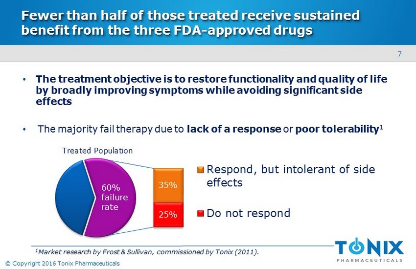 6 © Copyright 2016 Tonix Pharmaceuticals Fibromyalgia is a prevalent disorder but remains underdiagnosed 1 Lawrence et al, Arthritis Rheum 2008;58:26; Vincent et al, Arthritis Care Res 2013;65:786; Jones et al, Arthritis Rheum 2015;67:568. 2 Robinson RL et al, Pain Med 2012;13:1366. 3 Product sales derived from IMS MIDAS; IMS NDTI used to factor usage for fibromyalgia; data accessed April 2015. 4 Independent study conducted by IMS Consulting Group, April 2015 using IMS MIDAS (ex - manufacturing price), factored for fibromyalgia based on IMS National Disease and Therapeutic Index (NDTI). Affects 2 - 6% of U.S. adults • 1.1% diagnosis rate = 2.7 million U.S. adults 1 ‒ S uggests under - diagnosis • Approximately 2.3 million U.S. adults receive treatment 2 • Approved drugs achieved 2014 U.S. sales of $1.2 billion 3 ‒ Represent about 5.6 million prescriptions 4 Estimated that >22 million prescriptions are issued for the treatment of fibromyalgia (on - and off - label usage) each year 2,4