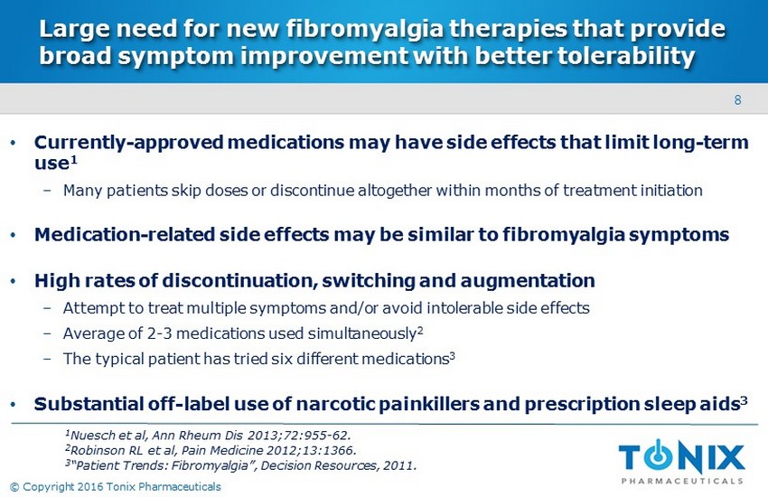 7 © Copyright 2016 Tonix Pharmaceuticals Fewer than half of those treated receive sustained benefit from the three FDA - approved drugs • The treatment objective is to restore functionality and quality of life by broadly improving symptoms while avoiding significant side effects • The majority fail therapy due to lack of a response or poor tolerability 1 Respond, but intolerant of side effects Do not respond 25% 35% 60% failure rate 1 Market research by Frost & Sullivan, commissioned by Tonix (2011). T reated P opulation