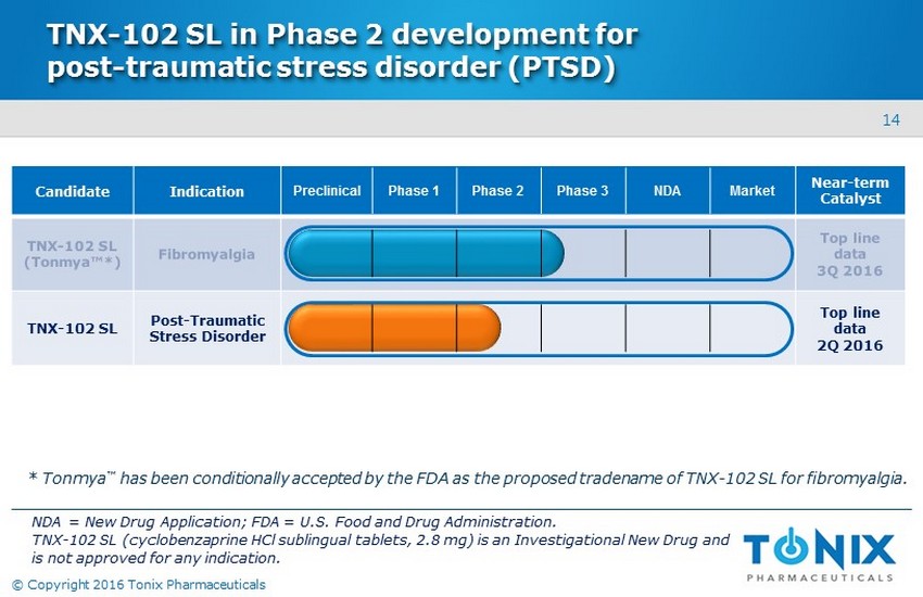 13 © Copyright 2016 Tonix Pharmaceuticals • Phase 3 AFFIRM Study is underway • Second Phase 3 Study (“REAFFIRM”) expected to begin in 2Q 2016 - E xpected to be similar to AFFIRM in design and size TNX - 102 SL in Phase 3 clinical development for fibromyalgia • Randomized, double - blind, placebo - controlled study in fibromyalgia • N=500; approximately 35 U.S. clinical sites • Primary efficacy endpoint: ‒ Difference in 30% pain responder analysis at Week 12 between TNX - 102 SL and placebo Placebo once - daily at bedtime 12 weeks TNX - 102 SL once - daily at bedtime N = 250 N = 250 2.8 mg open - label extension Source: Phase 2b BESTFIT study data. TNX - 102 SL (cyclobenzaprine HCl sublingual tablets, 2.8 mg) is an Investigational New Drug and is not approved for any indication. Top line data expected 3 Q 2016