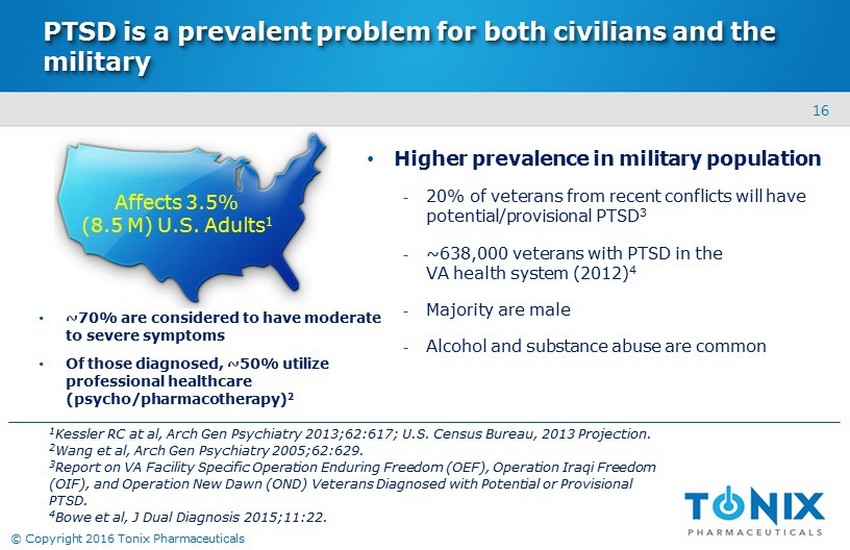 15 © Copyright 2016 Tonix Pharmaceuticals PTSD is a chronic stress disorder triggered by a traumatic event • PTSD is characterized by: • Considered a stress response, but prolonged and does not resolve with time ‒ 20% of women and 8 % of men who experience significant trauma develop PTSD 1 • Associated with significant life disruption ‒ Social isolation, inability to maintain employment, loss of independent living ‒ Unpredictable acts of violence, suicidal thoughts – re - experiencing the triggering event – negative alterations in mood/cognition – situation/stimulus avoidance – hypervigilance (anxiety, difficulty sleeping) 1 Kessler et al, Arch Gen Psychiatry 1995;52:1048.