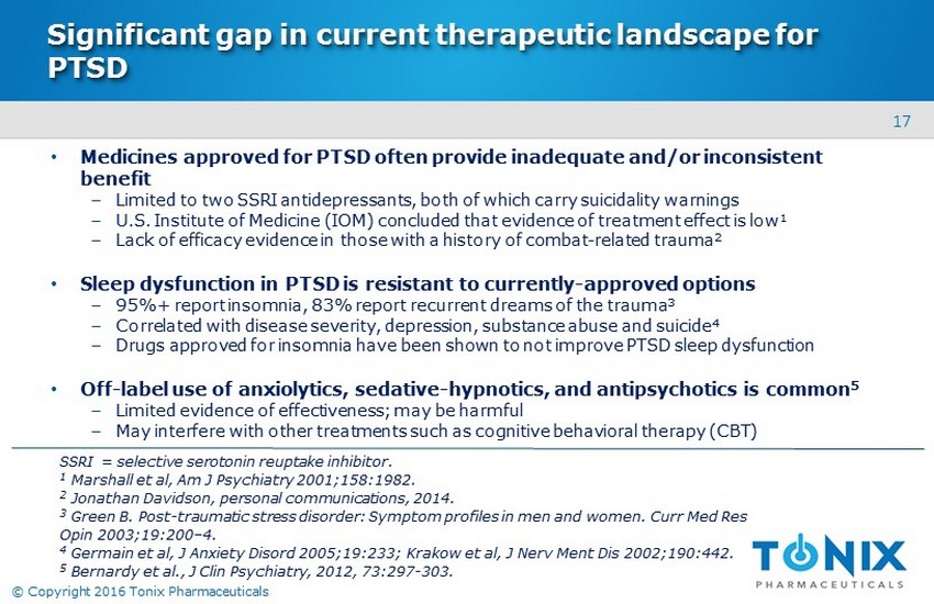 16 © Copyright 2016 Tonix Pharmaceuticals PTSD is a prevalent problem for both civilians and the military • ~70% are considered to have moderate to severe symptoms • Of those diagnosed, ~50% utilize professional healthcare (psycho/pharmacotherapy) 2 1 Kessler RC at al, Arch Gen Psychiatry 2013;62:617; U.S. Census Bureau, 2013 Projection. 2 Wang et al, Arch Gen Psychiatry 2005;62:629. 3 Report on VA Facility Specific Operation Enduring Freedom (OEF), Operation Iraqi Freedom (OIF), and Operation New Dawn (OND) Veterans Diagnosed with Potential or Provisional PTSD. 4 Bowe et al, J Dual Diagnosis 2015;11:22. Affects 3.5% (8.5 M) U.S. Adults 1 • Higher prevalence in military population - 20% of veterans from recent conflicts will have potential/provisional PTSD 3 - ~638,000 veterans with PTSD in the VA health system ( 2012) 4 - Majority are male - Alcohol and substance abuse are common