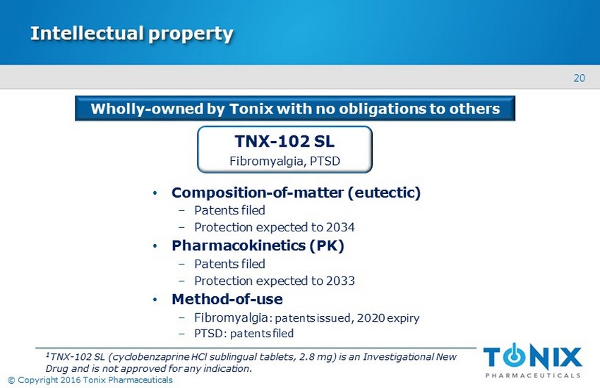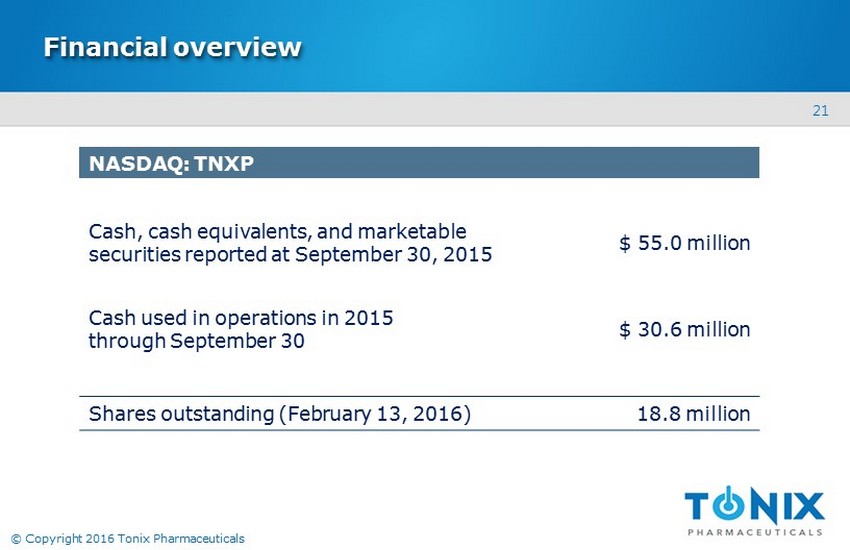 20 © Copyright 2016 Tonix Pharmaceuticals Intellectual property • Composition - of - matter (eutectic) ‒ Patents filed ‒ Protection expected to 2034 • Pharmacokinetics (PK) ‒ Patents filed ‒ Protection expected to 2033 • Method - of - use ‒ Fibromyalgia : patents issued, 2020 expiry ‒ PTSD: patents filed TNX - 102 SL Fibromyalgia , PTSD Wholly - owned by Tonix with no obligations to others 1 TNX - 102 SL (cyclobenzaprine HCl sublingual tablets, 2.8 mg) is an Investigational New Drug and is not approved for any indication.
