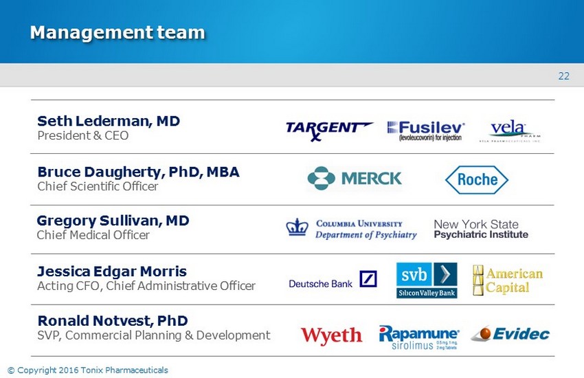 21 © Copyright 2016 Tonix Pharmaceuticals Financial overview NASDAQ: TNXP Cash, cash equivalents, and marketable securities reported at September 30, 2015 $ 55.0 million Cash used in operations in 2015 through September 30 $ 30.6 million Shares outstanding (February 13, 2016) 18.8 million